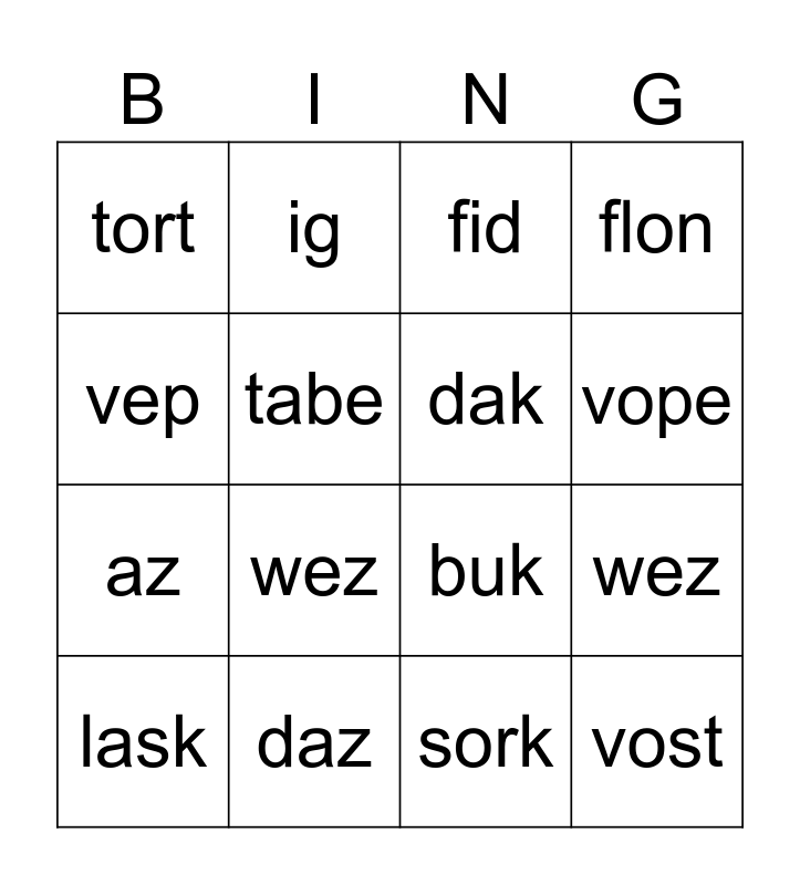 This bingo card has 41 words: Free!, buk, noke, dak, hab, fec, vope, lud, vep, vost, wez, flon, lask, sork, daz, fej, oc, tort, farp, fid, ong, wid, ish, az, if, ep, nok, clorv, wez, kek, wom, ig, fid, hab, vim, tabe, spife, prane, vute, neft and sup.