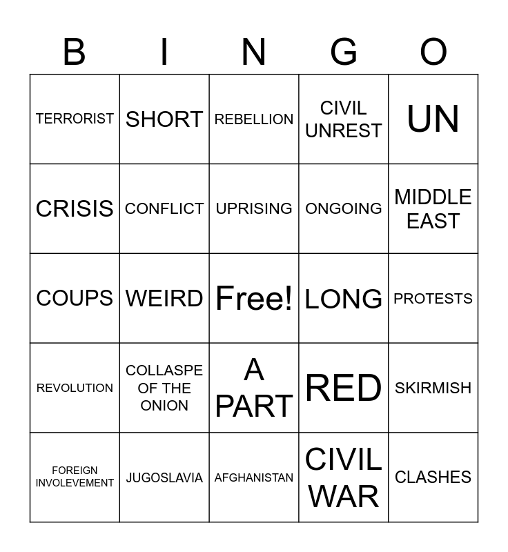This bingo card has a free space and 24 words: COLLASPE OF THE ONION, JUGOSLAVIA, UPRISING, FOREIGN INVOLEVEMENT, UN, TERRORIST, CRISIS, SHORT, LONG, A PART, ONGOING, COUPS, RED, SKIRMISH, CONFLICT, CIVIL WAR, PROTESTS, REBELLION, MIDDLE EAST, WEIRD, CLASHES, REVOLUTION, CIVIL UNREST and AFGHANISTAN.