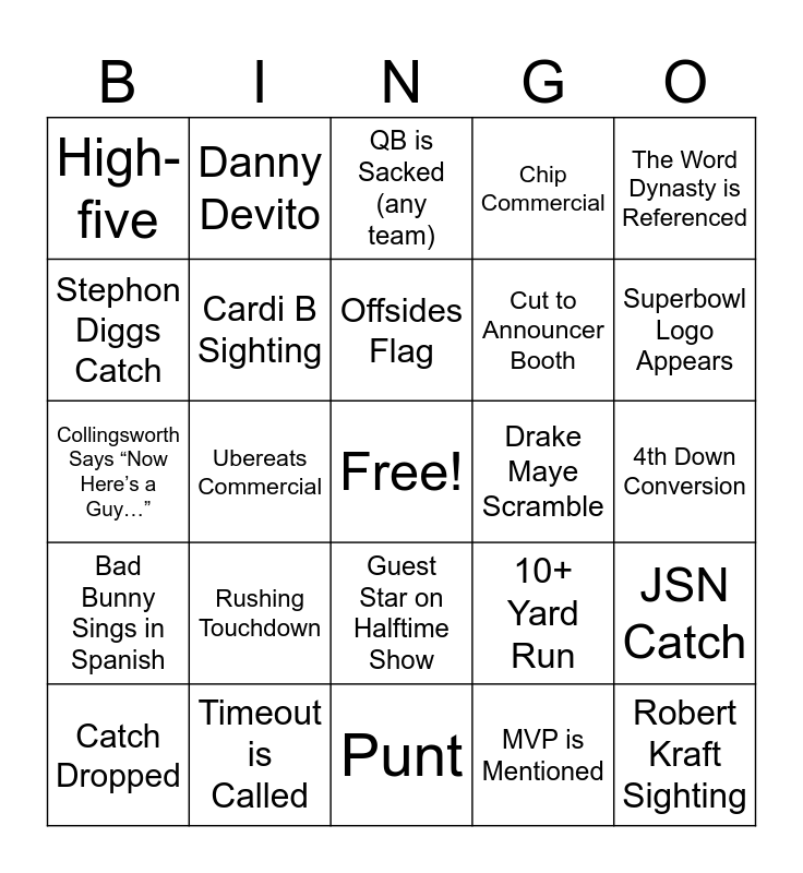 This bingo card has a free space and 35 words: Patriots Score, Seahawks Score, Field Goal, Cardi B Sighting, Guest Star on Halftime Show, Chip Commercial, Stephon Diggs Catch, Fumble or Interception, Offsides Flag, Announcer Mentions Darnold’s Oblique Injury, Collingsworth Says “Now Here’s a Guy…”, The Word Dynasty is Referenced, Fanduel Commercial, Dad Swears, High-five, Drake Maye Scramble, MVP is Mentioned, Ubereats Commercial, Bad Bunny Sings in Spanish, Robert Kraft Sighting, 10+ Yard Run, Catch Dropped, JSN Catch, Timeout is Called, QB is Sacked (any team), Superbowl Logo Appears, Tom Brady is Mentioned or Shown, Beer Commercial, Cut to Announcer Booth, 4th Down Conversion, False Start, Punt, Rushing Touchdown, Danny Devito and Coach Yells at Ref.