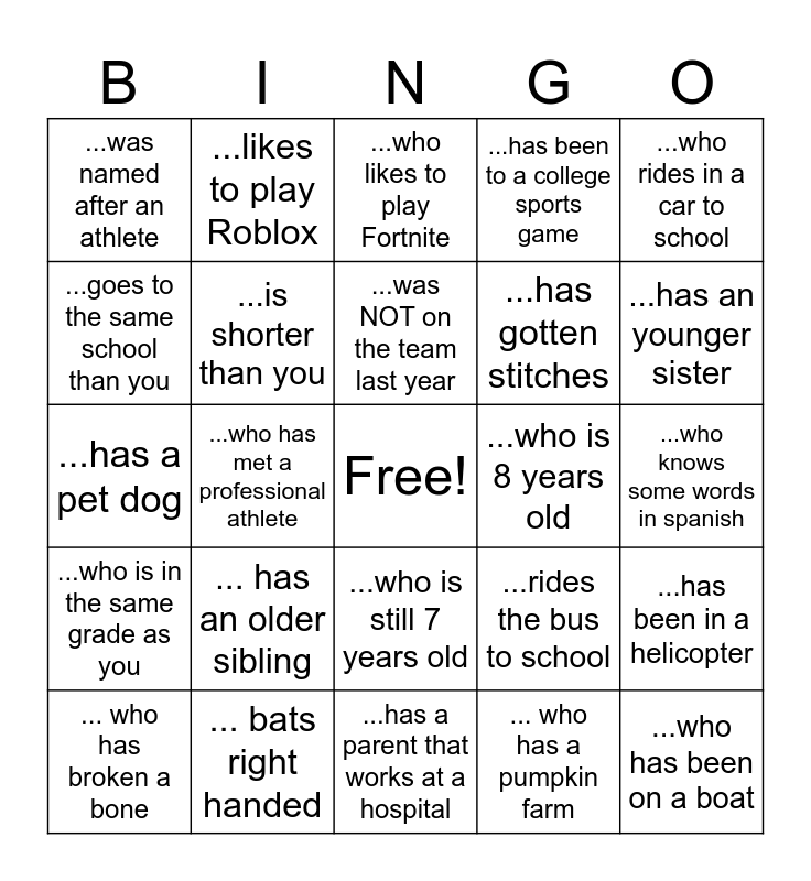 This bingo card has a free space and 24 words: ... has an older sibling, ... bats right handed, ...was NOT on the team last year, ... who has broken a bone, ...who rides in a car to school, ...was named after an athlete, ...goes to the same school than you, ...likes to play Roblox, ...who is 8 years old, ...who is still 7 years old, ...has gotten stitches, ...has a pet dog, ...rides the bus to school, ...has been in a helicopter, ...is shorter than you, ... who has a pumpkin farm, ...who knows some words in spanish, ...who likes to play Fortnite, ...has an younger sister, ...who has met a professional athlete, ...who has been on a boat, ...who is in the same grade as you, ...has been to a college sports game and ...has a parent that works at a hospital.