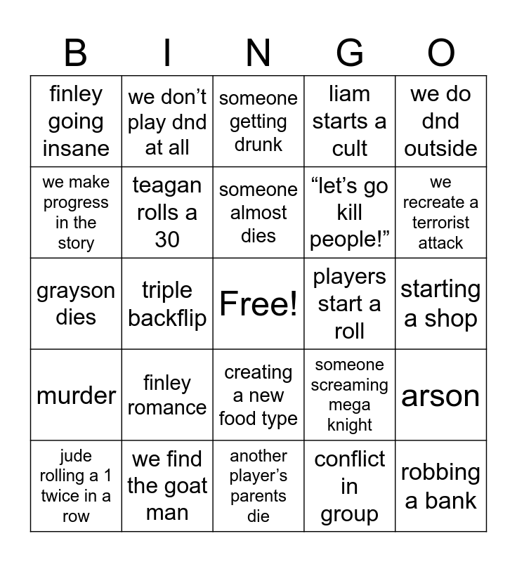 This bingo card has a free space and 28 words: arson, levi crash out, “let’s go kill people!”, conflict in group, we make progress in the story, someone getting drunk, we don’t play dnd at all, murder, players start a roll, jude rolling a 1 twice in a row, grayson dies, liam starts a cult, we find the goat man, another player’s parents die, we recreate a terrorist attack, players kill a whole town, finley romance, teagan rolls a 30, someone almost dies, creating a new food type, finley going insane, empire back from the dead, robbing a bank, triple backflip, starting a shop, someone screaming mega knight, we do dnd outside and we go all session without anyone being weird.