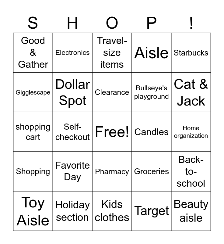This bingo card has a free space and 36 words: Free!, Bullseye, RedCard, Dollar Spot, Groceries, Shopping, Clearance, Endcap, Starbucks, Drive Up, Self-checkout, Aisle, Throw pillows, Candles, Cat & Jack, Good & Gather, Up & Up, Favorite Day, Beauty aisle, Travel-size items, Home organization, Back-to-school, Holiday section, Toy Aisle, Kids clothes, Electronics, shopping cart, Checkout line, Bullseye's playground, Gigglescape, Our Generation, Barbie, Target, Pharmacy, Cafe' and Customer Service.