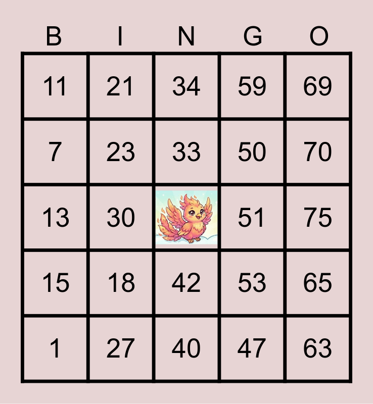 This bingo card has a free space and 24 words: 1, 18, 33, 47, 69, 11, 21, 34, 51, 75, 13, 23, 53, 65, 7, 27, 40, 59, 70, 15, 30, 42, 50 and 63.