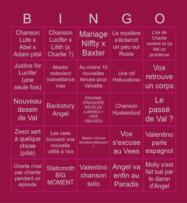 This bingo card has a free space and 24 words: Les vees trouvent une nouvelle utilité à Vox, Staticmoth BIG MOMENT, Au moins 10 nouvelles tenues pour Velvette, Charlie n'est pas chiante pendant un épisode, L'ex de Charlie revient et ça fait un problème, Chanson Lute x Abel x Adam pitié, Justice for Lucifer (une seule fois), Chanson Lucifer x Lilith (x Charlie ?), Chanson Huskerdust, Alastor s'ouvre émotionnellement ?, Une ref Helluvaboss, Nouveau dessin de Val, Vox s'excuse au Vees, Valentino parle espagnol, Alastor redevient malveillance max, Angel va enfin au Paradis, Le passé de Val ?, Mariage Niffty x Baxter, Vox retrouve un corps, Backstory Angel, Molly s'est fait tué par le daron d'Angel, Zeezi sert à quelque chose (pitié), Le mystère s'éclaircit un peu sur Rosie and Valentino chanson solo.