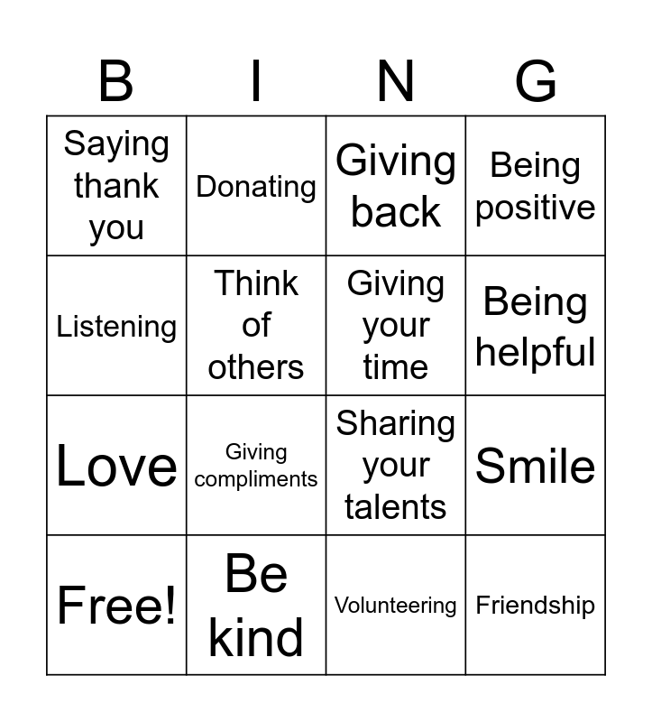 This bingo card has 23 words: Friendship, Sharing, Being helpful, Being patient, Listening, Saying thank you, Think of others, Donating, Free!, Working together, Giving compliments, Love, Offer a helping hand, Clean up, Be kind, Saying hello, Giving back, Sharing your talents, Giving your time, Smile, Being positive, Volunteering and Show respect.