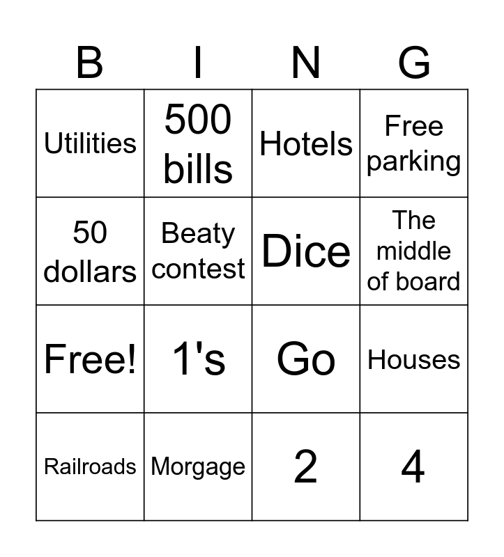 This bingo card has 20 words: Railroads, Jail, Hotels, Houses, 6, 1's, 2, Free parking, Free!, 500 bills, Go, The middle of board, Utilities, Morgage, Dice, Properties, 50 dollars, Beaty contest, 5 minutes + and 4.