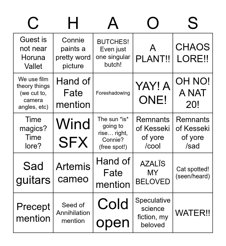 This bingo card has a free space and 39 words: Dream sequence, Flashback, Dust coughing, Hand of Fate mention, Precept mention, Hand of Fate mention, Foreshadowing, Time skip, CHAOS LORE!!, Sad guitars, Wind SFX, A PLANT!!, WATER!!, Remnants of Kesseki of yore /sad, Remnants of Kesseki of yore /cool, Artemis cameo, Funeral rites, Guest is not near Horuna Vallet, Guest is near Horuna Valley, AZALÏS MY BELOVED, We use film theory things (we cut to, camera angles, etc), Cold open, YAY! A ONE!, OH NO! A NAT 20!, No dice are rolled, Cool clothing description, Someone breaks the fourth wall, Poetry, Sea screams/ barks in chat/lh, Connie paints a pretty word picture, Connie paints a scary word picture, Complicated feelings about grief, BUTCHES! Even just one singular butch!, Seed of Annihilation mention, Speculative science fiction, my beloved, Raja-Yeowang Mining Corporation mention (I sneer), Cat spotted! (seen/heard), Time magics? Time lore? and Sunrise symbolism.