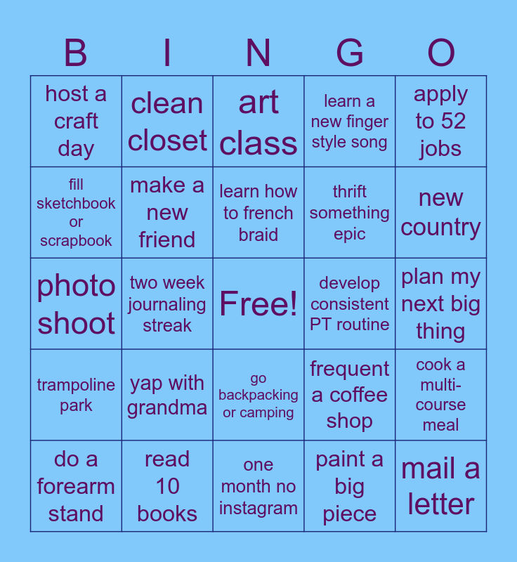 This bingo card has a free space and 24 words: yap with grandma, read 10 books, learn how to french braid, do a forearm stand, apply to 52 jobs, host a craft day, fill sketchbook or scrapbook, clean closet, develop consistent PT routine, go backpacking or camping, thrift something epic, photo shoot, frequent a coffee shop, cook a multi-course meal, make a new friend, paint a big piece, plan my next big thing, art class, new country, two week journaling streak, mail a letter, trampoline park, learn a new finger style song and one month no instagram.