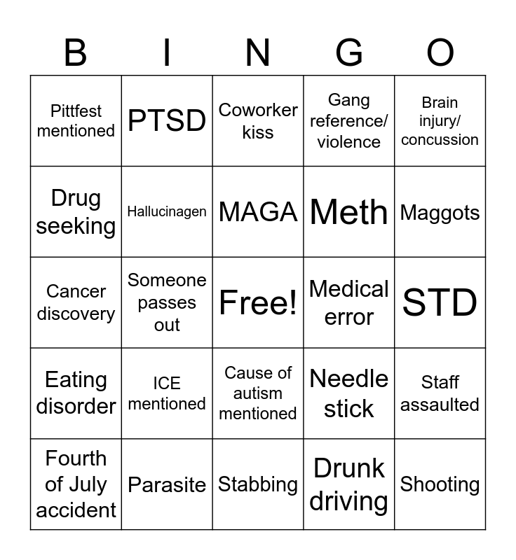 This bingo card has a free space and 24 words: Fourth of July accident, ICE mentioned, MAGA, Drunk driving, Brain injury/ concussion, Pittfest mentioned, PTSD, Coworker kiss, Medical error, STD, Cancer discovery, Hallucinagen, Needle stick, Staff assaulted, Drug seeking, Parasite, Stabbing, Gang reference/ violence, Maggots, Eating disorder, Someone passes out, Cause of autism mentioned, Meth and Shooting.