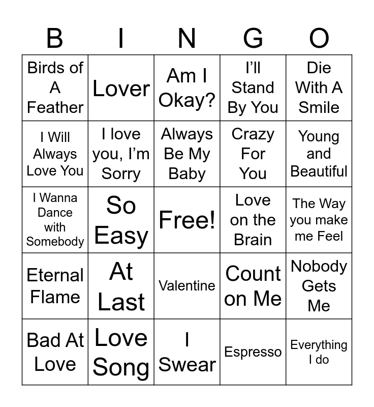 This bingo card has a free space and 24 words: At Last, Love Song, Always Be My Baby, Bad At Love, Die With A Smile, Birds of A Feather, I Will Always Love You, Lover, Love on the Brain, Valentine, Crazy For You, I Wanna Dance with Somebody, Count on Me, Nobody Gets Me, I love you, I’m Sorry, Espresso, The Way you make me Feel, Am I Okay?, Young and Beautiful, So Easy, Everything I do, Eternal Flame, I’ll Stand By You and I Swear.