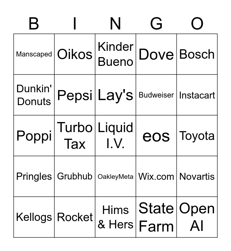 This bingo card has 48 words: Free!, Liquid I.V., Squarespace, Hims & Hers, Grubhub, Fanatics, Oikos, Michelob Ultra, Dunkin' Donuts, Hellmann's, Pepsi, Dove, Novartis, Wix.com, Base44, Levi's, Lay's, eos, Spectrum, Bosch, Turbo Tax, State Farm, Manscaped, Budweiser, Bud Light, Instacart, Kellogs, Nerds, OakleyMeta, Pringles, Ramp, Ritz, Ro, Skittles, Rocket, Svedka, Totino's Pizza Rolls, Toyota, Uber Eats, Liquid Death, Salesforce, Open AI, Kinder Bueno, Tree Hut, Poppi, WeatherTech, Come Near and Cadillac (F1).