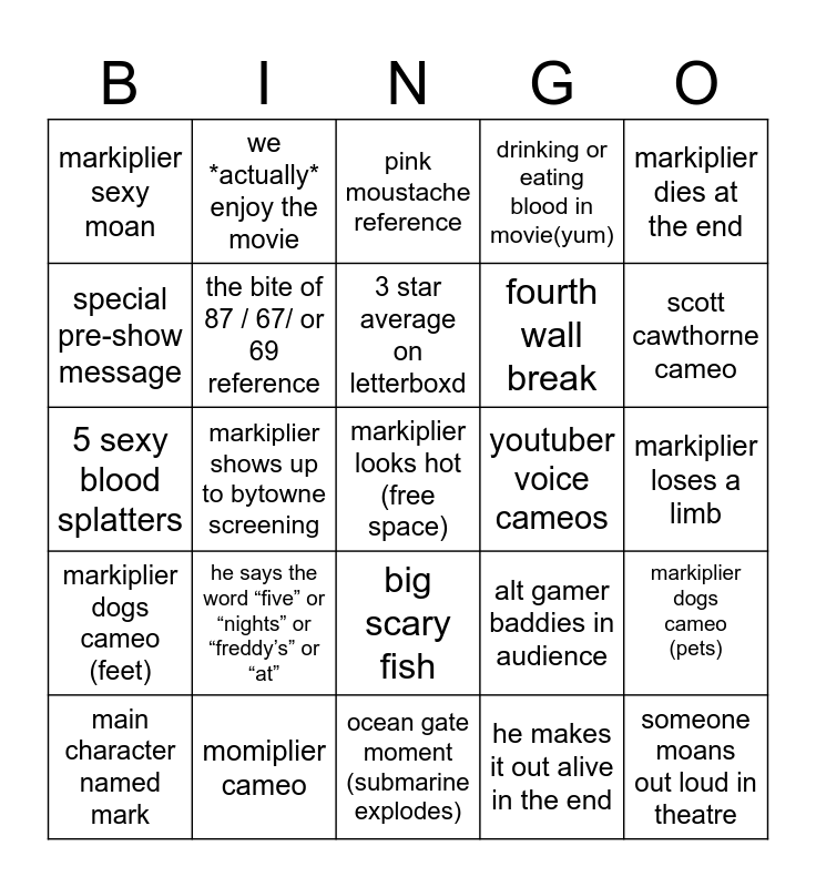 This bingo card has a free space and 24 words: he says the word “five” or “nights” or “freddy’s” or “at”, momiplier cameo, 3 star average on letterboxd, main character named mark, markiplier dies at the end, markiplier sexy moan, special pre-show message, we *actually* enjoy the movie, youtuber voice cameos, big scary fish, fourth wall break, 5 sexy blood splatters, alt gamer baddies in audience, markiplier dogs cameo (pets), the bite of 87 / 67/ or 69 reference, he makes it out alive in the end, markiplier loses a limb, pink moustache reference, scott cawthorne cameo, markiplier shows up to bytowne screening, someone moans out loud in theatre, markiplier dogs cameo (feet), drinking or eating blood in movie(yum) and ocean gate moment (submarine explodes).