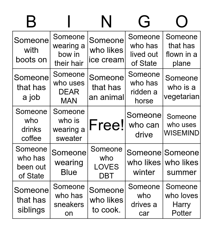 This bingo card has a free space and 24 words: Someone wearing Blue, Someone who has sneakers on, Someone that has an animal, Someone that has siblings, Someone that has flown in a plane, Someone with boots on, Someone that has a job, Someone wearing a bow in their hair, Someone who can drive, Someone who LOVES DBT, Someone who has ridden a horse, Someone who drinks coffee, Someone who likes winter, Someone who likes summer, Someone who uses DEAR MAN, Someone who drives a car, Someone who uses WISEMIND, Someone who likes ice cream, Someone who is a vegetarian, Someone who is wearing a sweater, Someone who loves Harry Potter, Someone who has been out of State, Someone who has lived out of State and Someone who likes to cook..
