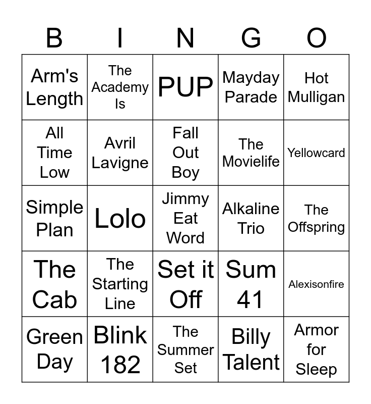 This bingo card has a free space and 24 words: The Starting Line, Blink 182, Fall Out Boy, Green Day, Hot Mulligan, Arm's Length, All Time Low, The Academy Is, Alkaline Trio, Set it Off, The Movielife, Simple Plan, Sum 41, Alexisonfire, Avril Lavigne, Billy Talent, The Offspring, PUP, Yellowcard, Lolo, Armor for Sleep, The Cab, Mayday Parade and The Summer Set.