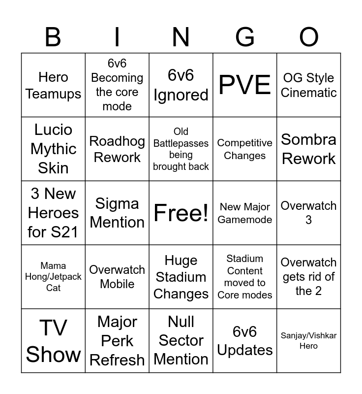 This bingo card has a free space and 24 words: Overwatch Mobile, Major Perk Refresh, Old Battlepasses being brought back, TV Show, OG Style Cinematic, Hero Teamups, Lucio Mythic Skin, 6v6 Becoming the core mode, New Major Gamemode, Huge Stadium Changes, Competitive Changes, 3 New Heroes for S21, Stadium Content moved to Core modes, Overwatch gets rid of the 2, Roadhog Rework, 6v6 Updates, Overwatch 3, 6v6 Ignored, Sombra Rework, Sigma Mention, Sanjay/Vishkar Hero, Mama Hong/Jetpack Cat, PVE and Null Sector Mention.