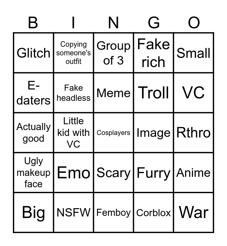 This bingo card has a free space and 24 words: Emo, NSFW, Meme, Big, Small, Glitch, E-daters, Copying someone's outfit, Image, Scary, Troll, Actually good, Furry, Anime, Fake headless, Corblox, Rthro, Group of 3, VC, Little kid with VC, War, Ugly makeup face, Fake rich and Femboy.