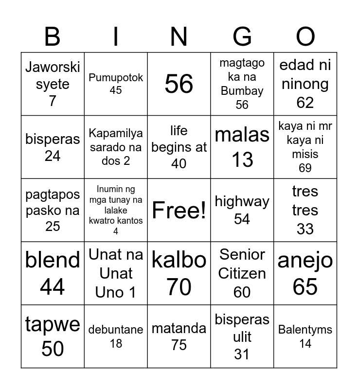 This bingo card has a free space and 24 words: Unat na Unat Uno 1, debuntane 18, life begins at 40, tapwe 50, edad ni ninong 62, Jaworski syete 7, bisperas 24, Pumupotok 45, highway 54, kalbo 70, malas 13, pagtapos pasko na 25, Senior Citizen 60, anejo 65, Kapamilya sarado na dos 2, bisperas ulit 31, tres tres 33, 56, kaya ni mr kaya ni misis 69, Inumin ng mga tunay na lalake kwatro kantos 4, Balentyms 14, blend 44, magtago ka na Bumbay 56 and matanda 75.