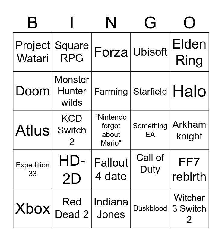This bingo card has a free space and 24 words: HD-2D, Red Dead 2, Farming, Xbox, Elden Ring, Project Watari, Doom, Square RPG, Something EA, Fallout 4 date, Starfield, Atlus, Call of Duty, FF7 rebirth, Monster Hunter wilds, Duskblood, Arkham knight, Forza, Halo, KCD Switch 2, Witcher 3 Switch 2, Expedition 33, Ubisoft and Indiana Jones.