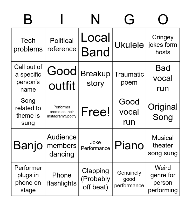 This bingo card has a free space and 34 words: People Dressed on Theme, Genuinely good performance, Duet, Harmonica, Banjo, Good outfit, Cringey jokes form hosts, Performer plugs in phone on stage, Political reference, Religious reference, Breakup story, Local Band, Frank Sinatra Guy, Billboard hot 100 song sung, Good vocal run, Bad vocal run, Phone flashlights, Song related to theme is sung, Audience members dancing, Piano, Joke Performance, Bad performance, Tech problems, Original Song, Clapping (Probably off beat), Weird genre for person performing, Ukulele, Girl with guitar, Traumatic poem, Call out of a specific person's name, Performer messes up and starts over, Performer promotes their instagram/Spotify, Musical theater song sung and Dramatic pause in poem.