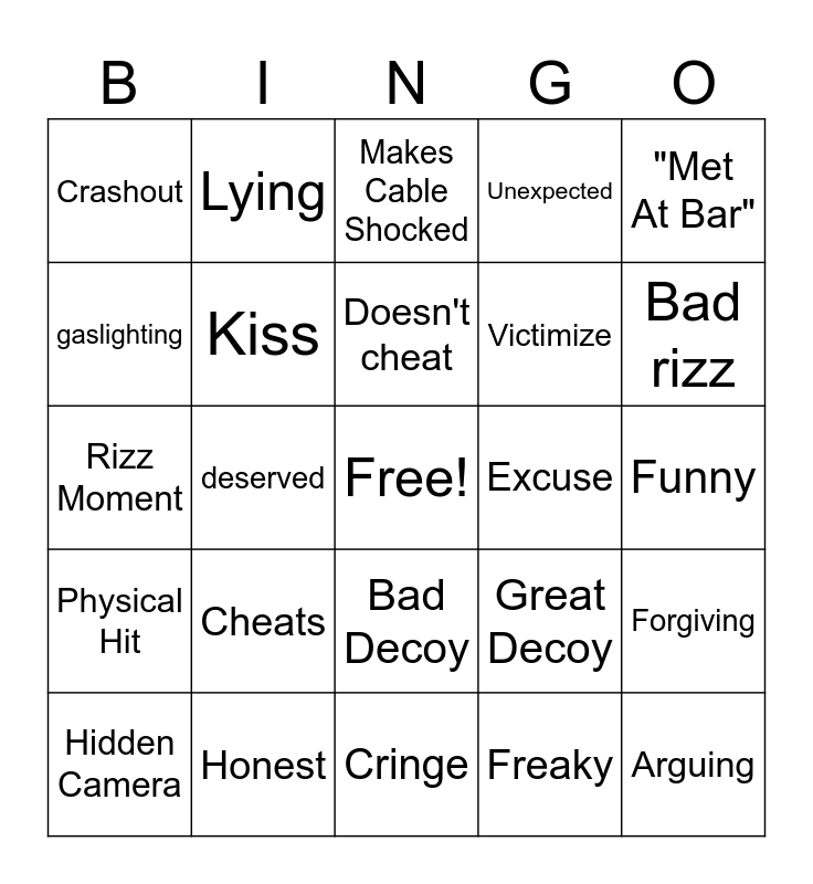 This bingo card has a free space and 24 words: Cheats, Honest, Doesn't cheat, Hidden Camera, "Met At Bar", Crashout, gaslighting, Lying, Excuse, Bad Decoy, Victimize, Rizz Moment, Great Decoy, Forgiving, Kiss, Freaky, Funny, Makes Cable Shocked, Bad rizz, deserved, Arguing, Physical Hit, Unexpected and Cringe.