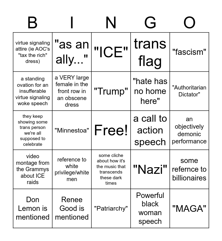 This bingo card has a free space and 29 words: Don Lemon is mentioned, a speech ending with a fist in the air, "Minnestoa", Land acknowledgment, virtue signaling attire (ie AOC's "tax the rich" dress), "ICE", a VERY large female in the front row in an obscene dress, reference to white privilege/white men, a call to action speech, Renee Good is mentioned, an objectively demonic performance, "MAGA", "Patriarchy", Powerful black woman speech, "Authoritarian Dictator", Alex Pretti is mentioned, some cliche about how it's the music that transcends these dark times, video montage from the Grammys about ICE raids, "fascism", they keep showing some trans person we're all supposed to celebrate, "Nazi", some speech about women empowerment / feminst woe is me speech, "hate has no home here", a standing ovation for an insufferable virtue signaling woke speech, trans flag, "as an ally...", some refernce to billionaires, "Trump" and "protect trans kids".