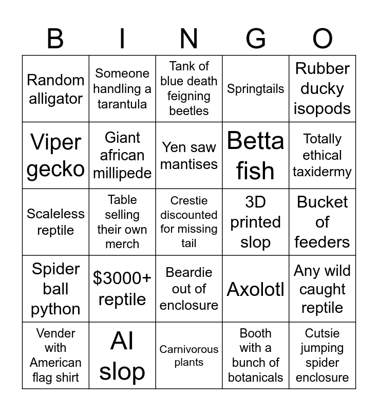 This bingo card has a free space and 24 words: $3000+ reptile, AI slop, Yen saw mantises, Vender with American flag shirt, Rubber ducky isopods, Random alligator, Viper gecko, Someone handling a tarantula, 3D printed slop, Beardie out of enclosure, Betta fish, Scaleless reptile, Axolotl, Any wild caught reptile, Giant african millipede, Booth with a bunch of botanicals, Bucket of feeders, Tank of blue death feigning beetles, Totally ethical taxidermy, Table selling their own merch, Cutsie jumping spider enclosure, Spider ball python, Springtails and Carnivorous plants.