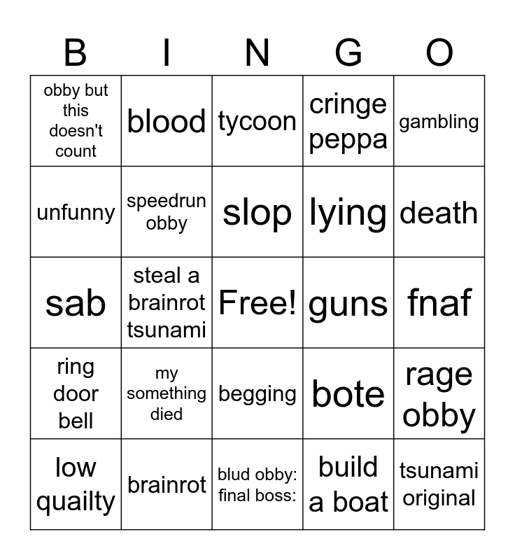 This bingo card has a free space and 24 words: my something died, brainrot, slop, low quailty, gambling, obby but this doesn't count, unfunny, blood, guns, begging, lying, sab, bote, rage obby, speedrun obby, build a boat, fnaf, tycoon, death, steal a brainrot tsunami, tsunami original, ring door bell, cringe peppa and blud obby: final boss:.