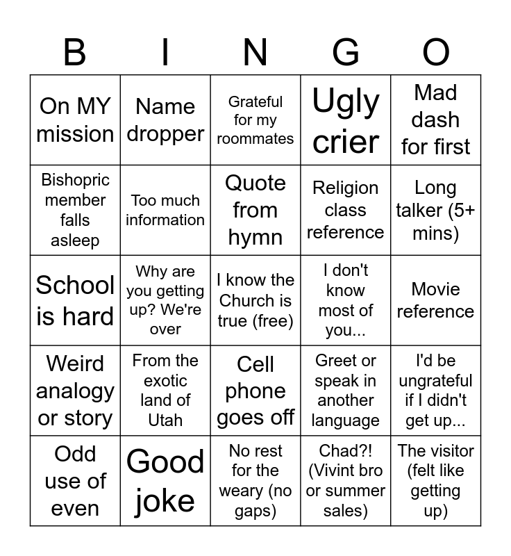 This bingo card has a free space and 29 words: Odd use of even, Engaged brag, Why are you getting up? We're over, Testimony of trials, On MY mission, Grateful for my roommates, Too much information, From the exotic land of Utah, I don't know most of you..., Good joke, Movie reference, The visitor (felt like getting up), No rest for the weary (no gaps), Chad?! (Vivint bro or summer sales), Long talker (5+ mins), I truly love you/this ward/the bishopric, Cell phone goes off, Weird analogy or story, Mad dash for first, School is hard, Greet or speak in another language, Bad joke, Religion class reference, Bishopric member falls asleep, Ugly crier, Name dropper, I'd be ungrateful if I didn't get up..., Quote from hymn and Odd use of even.