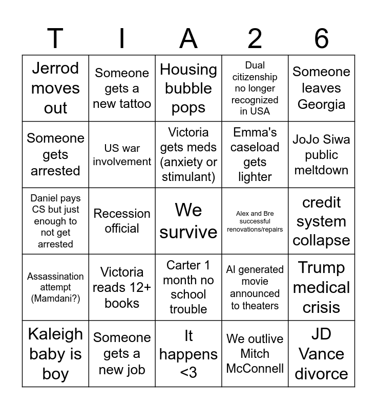 This bingo card has a free space and 24 words: Victoria reads 12+ books, Someone gets a new job, Victoria gets meds (anxiety or stimulant), Kaleigh baby is boy, Someone leaves Georgia, Jerrod moves out, Someone gets arrested, Someone gets a new tattoo, Alex and Bre successful renovations/repairs, Carter 1 month no school trouble, Emma's caseload gets lighter, Daniel pays CS but just enough to not get arrested, AI generated movie announced to theaters, Trump medical crisis, US war involvement, We outlive Mitch McConnell, credit system collapse, Housing bubble pops, JoJo Siwa public meltdown, Recession official, JD Vance divorce, Assassination attempt (Mamdani?), Dual citizenship no longer recognized in USA and It happens <3.