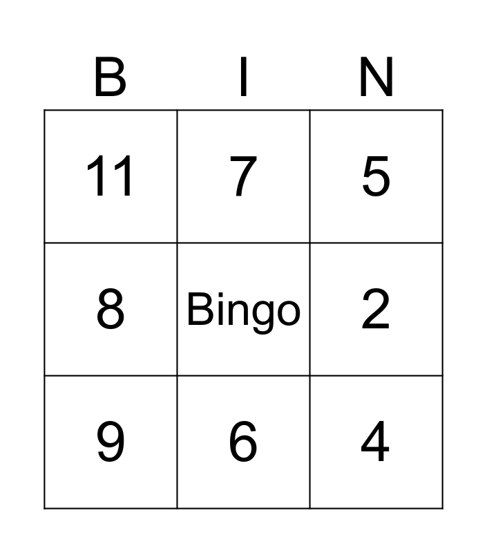 This bingo card has a free space and 8 words: 2, 5, 7, 9, 11, 4, 8 and 6.