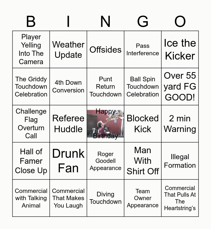 This bingo card has a free space and 32 words: Team Owner Appearance, Fandual Commercial, Referee Huddle, Celebrity Cameo Commercial, Hall of Famer Close Up, 4th Down Conversion, Ice the Kicker, Illegal Formation, Weather Update, Quarterback Sack, Punt Return Touchdown, Offsides, “It All Comes Down To This”, Close Up Sad Fan, Blocked Kick, Doritos Commercial, Commercial with Talking Animal, Challenge Flag Overturn Call, Roger Goodell Appearance, Drunk Fan, Man With Shirt Off, Beer Commercial, 2 min Warning, Commercial That Makes You Laugh, Commercial That Pulls At The Heartstring’s, Pass Interference, Ball Spin Touchdown Celebration, The Griddy Touchdown Celebration, Player Yelling Into The Camera, Diving Touchdown, Missed FG and Over 55 yard FG GOOD!.