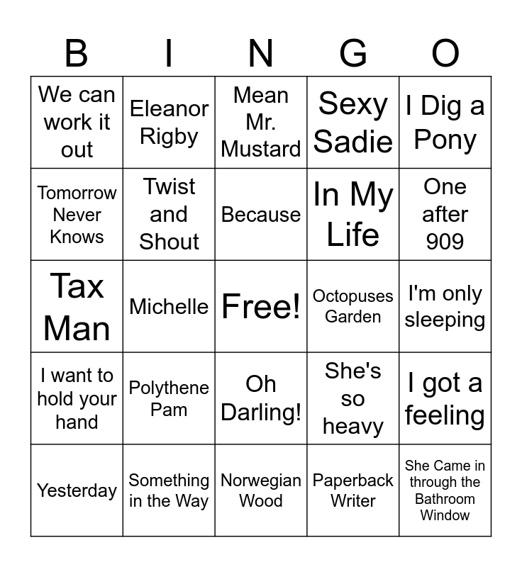 This bingo card has a free space and 34 words: It's Getting Better all the time, Paperback Writer, Back in the USSR, Love Me Do, I want to hold your hand, Twist and Shout, I Dig a Pony, Yesterday, Eleanor Rigby, Get Back, Because, Mean Mr. Mustard, Baby you can drive my car, Girl, Octopuses Garden, One after 909, Something in the Way, Tax Man, Polythene Pam, She's so heavy, Oh Darling!, Happiness is a warm gun, We can work it out, I'm only sleeping, Norwegian Wood, She Came in through the Bathroom Window, Sexy Sadie, Helter Skelter, In My Life, Tomorrow Never Knows, Hey Jude, Michelle, I got a feeling and A little help from my friends.