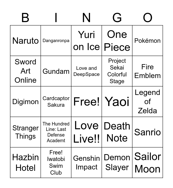 This bingo card has a free space and 24 words: The Hundred Line: Last Defense Academt, Free! Iwatobi Swim Club, Love and DeepSpace, Hazbin Hotel, Pokémon, Naruto, Sword Art Online, Danganronpa, Yaoi, Love Live!!, Project Sekai Colorful Stage, Digimon, Death Note, Sanrio, Gundam, Demon Slayer, Legend of Zelda, Yuri on Ice, Fire Emblem, Cardcaptor Sakura, Sailor Moon, Stranger Things, One Piece and Genshin Impact.