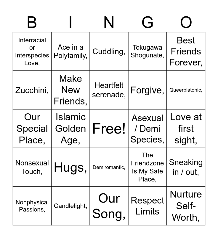 This bingo card has a free space and 89 words: Late Bloomer,, Taking It Slow,, Demiromantic,, Courtly Romance,, Demisexual Villain Slowly Falls in Love with Hero,, Dancing,, Chocolates,, Sending flowers,, Love letters,, Odd couple,, Long-distance relationship,, Secret crush,, Sneaking in / out,, Love at first sight,, Wedding ring,, Heartfelt serenade,, Separation & reunion,, First kiss,, Dramatic proposal,, Spin the bottle,, Valentines,, Such a gentleman,, Our Song,, Secret Messages,, Our Special Place,, Candlelight,, Dinner for Two,, Love Without Limits,, Victorian Era,, Age of Enlightenment,, Tokugawa Shogunate,, Islamic Golden Age,, Roaring Twenties,, Interracial or Interspecies Love,, The Cake Is Not a Lie,, Cuddling,, Zucchini,, I'm Sexual - But I'm Ace for You,, Queerplatonic,, Nonphysical Passions,, Nonsexual Touch,, Ace Pride Flag,, This Is Not a Date,, Aromantic Extrovert,, The Friendzone Is My Safe Place,, Asexual / Demi Species,, Bromance,, I Only Make Love with Myself,, Ace / Demi Deities,, Ace in a Polyfamily,, My Aromantic Valentine,, Romance-free Plot Zone,, Ace Hero Doesn't Want the Girl,, Marriage of Convenience,, Ace / Demi Parents,, I'll Be Your Wingman,, No Such Thing as "Just" Friends,, Chasing bubbles blown by someone else,, Falling asleep in your clothes,, Someone reads a story to you,, Visiting the zoo together,, Sleeping with a stuffed animal,, Sensual Massage,, Humor,, Solving Puzzles as a Team,, Enjoy Some Private Time,, Talk with a Friend,, Laughter,, Play a Musical Instrument,, Hugs,, Nurture Self-Worth,, Pets,, Family Traditions,, Forgive,, Make New Friends,, Respect Limits, Set Attainable Goals,, Surrender,, Be Here Now,, A Girl and Her Horse,, Best Friends Forever,, Working on the Car Together,, He Ain't Heavy He's My Brother,, Falling Asleep,, Holding Someone's Hand,, Peacemaking,, Reconciled Differences,, Helping a Stranger, and Cooking with Love,.