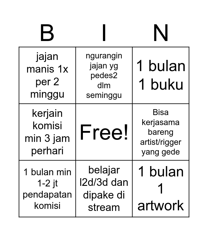 This bingo card has a free space and 8 words: Bisa kerjasama bareng artist/rigger yang gede, 1 bulan 1 buku, ngurangin jajan yg pedes2 dlm seminggu, 1 bulan min 1-2 jt pendapatan komisi, jajan manis 1x per 2 minggu, 1 bulan 1 artwork, kerjain komisi min 3 jam perhari and belajar l2d/3d dan dipake di stream.