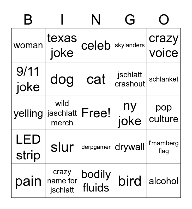This bingo card has a free space and 24 words: slur, crazy name for jschlatt, cat, pain, crazy voice, woman, 9/11 joke, texas joke, ny joke, derpgamer, jschlatt crashout, yelling, drywall, l'mamberg flag, dog, bird, pop culture, celeb, schlanket, wild jaschlatt merch, alcohol, LED strip, skylanders and bodily fluids.