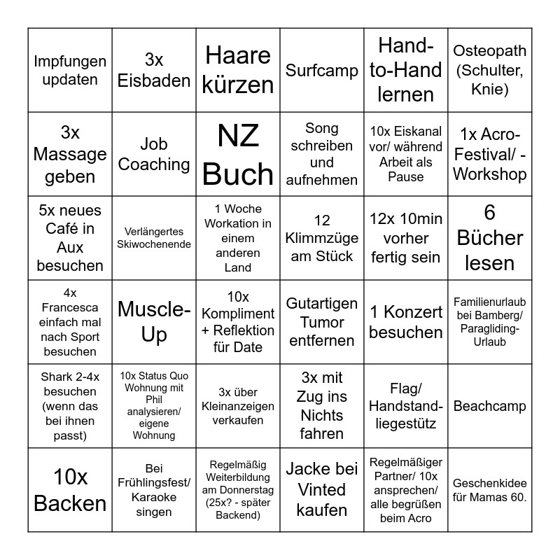 This bingo card has 36 words: 3x mit Zug ins Nichts fahren, 3x über Kleinanzeigen verkaufen, Jacke bei Vinted kaufen, 3x Massage geben, 4x Francesca einfach mal nach Sport besuchen, 12 Klimmzüge am Stück, Job Coaching, Regelmäßig Weiterbildung am Donnerstag (25x? - später Backend), Hand-to-Hand lernen, Flag/ Handstand-liegestütz, 1x Acro-Festival/ -Workshop, Surfcamp, Beachcamp, Verlängertes Skiwochenende, Song schreiben und aufnehmen, Impfungen updaten, Shark 2-4x besuchen (wenn das bei ihnen passt), 12x 10min vorher fertig sein, 5x neues Café in Aux besuchen, Haare kürzen, 1 Woche Workation in einem anderen Land, Muscle-Up, Gutartigen Tumor entfernen, 10x Kompliment + Reflektion für Date, 1 Konzert besuchen, 3x Eisbaden, 10x Eiskanal vor/ während Arbeit als Pause, Bei Frühlingsfest/ Karaoke singen, NZ Buch, Osteopath (Schulter, Knie), Geschenkidee für Mamas 60., 10x Backen, Familienurlaub bei Bamberg/ Paragliding-Urlaub, 6 Bücher lesen, 10x Status Quo Wohnung mit Phil analysieren/ eigene Wohnung and Regelmäßiger Partner/ 10x ansprechen/ alle begrüßen beim Acro.