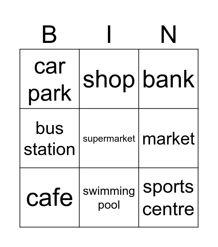 This bingo card has 14 words: library, cinema, cafe, shop, bus station, supermarket, sports centre, hospital, swimming pool, car park, school, market, bank and park.
