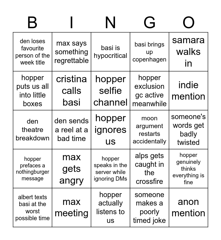 This bingo card has a free space and 26 words: hopper speaks in the server while ignoring DMs, someone makes a poorly timed joke, hopper selfie channel, max meeting, samara walks in, den loses favourite person of the week title, hopper puts us all into little boxes, max says something regrettable, someone's words get badly twisted, alps gets caught in the crossfire, hopper exclusion gc active meanwhile, den theatre breakdown, hopper genuinely thinks everything is fine, albert texts basi at the worst possible time, den sends a reel at a bad time, hopper half listens to us, basi brings up copenhagen, hopper prefaces a nothingburger message, basi is hypocritical, anon mention, indie mention, hopper actually listens to us, moon argument restarts accidentally, max gets angry, cristina calls basi and basi ibis paint shitpost.