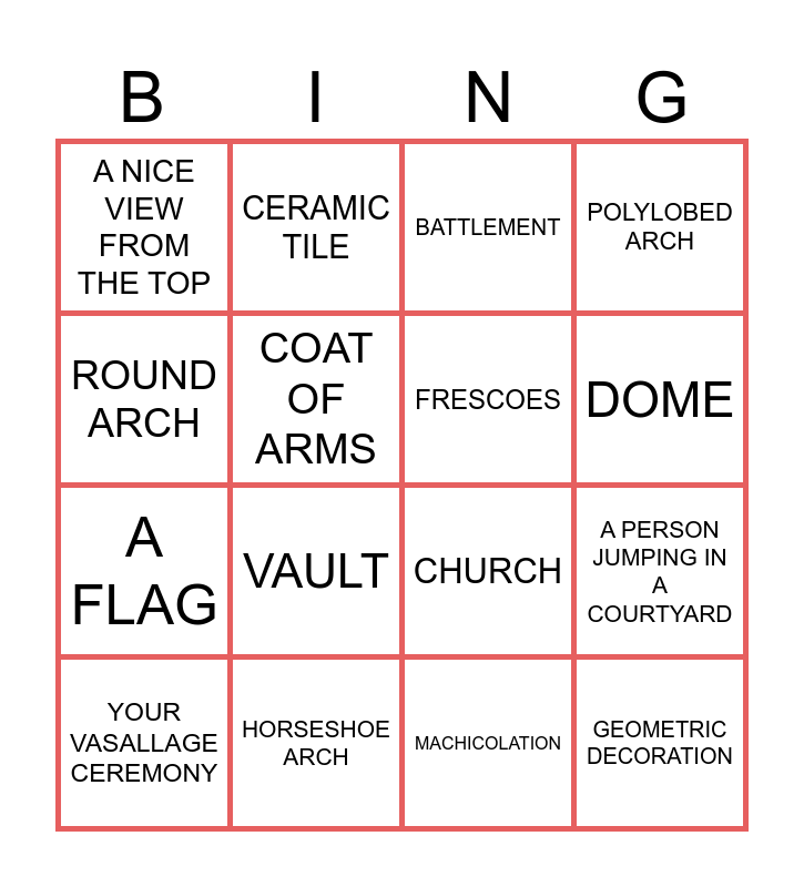 This bingo card has 16 words: HORSESHOE ARCH, A PERSON JUMPING IN A COURTYARD, BATTLEMENT, A NICE VIEW FROM THE TOP, A FLAG, CERAMIC TILE, CHURCH, MACHICOLATION, ROUND ARCH, COAT OF ARMS, YOUR VASALLAGE CEREMONY, POLYLOBED ARCH, VAULT, DOME, FRESCOES and GEOMETRIC DECORATION.
