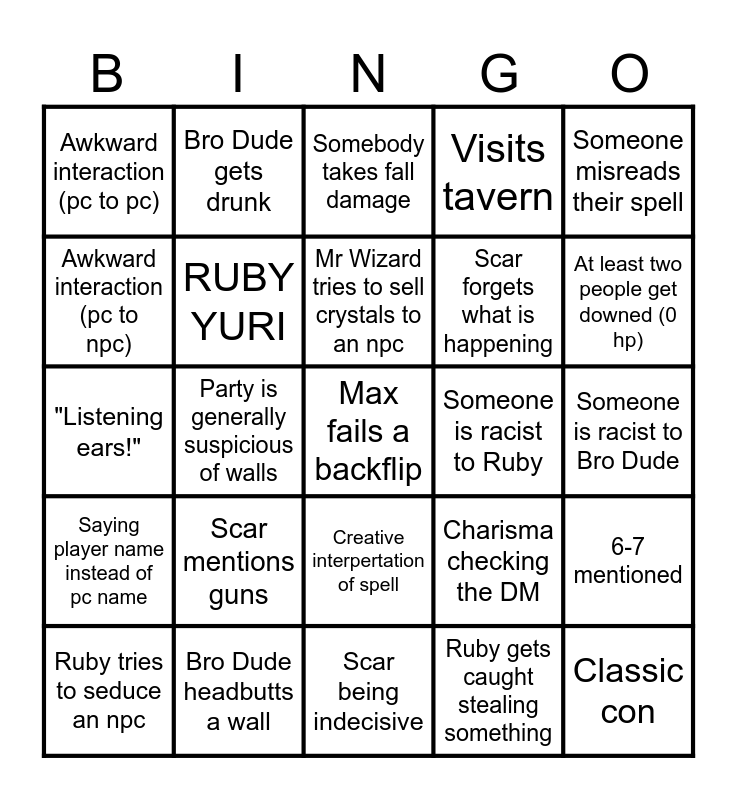 This bingo card has a free space and 24 words: Scar mentions guns, Bro Dude headbutts a wall, Mr Wizard tries to sell crystals to an npc, Ruby tries to seduce an npc, Someone misreads their spell, Awkward interaction (pc to pc), Awkward interaction (pc to npc), Bro Dude gets drunk, Someone is racist to Ruby, Creative interpertation of spell, Scar forgets what is happening, "Listening ears!", Charisma checking the DM, 6-7 mentioned, RUBY YURI, Ruby gets caught stealing something, Someone is racist to Bro Dude, Somebody takes fall damage, At least two people get downed (0 hp), Party is generally suspicious of walls, Classic con, Saying player name instead of pc name, Visits tavern and Scar being indecisive.