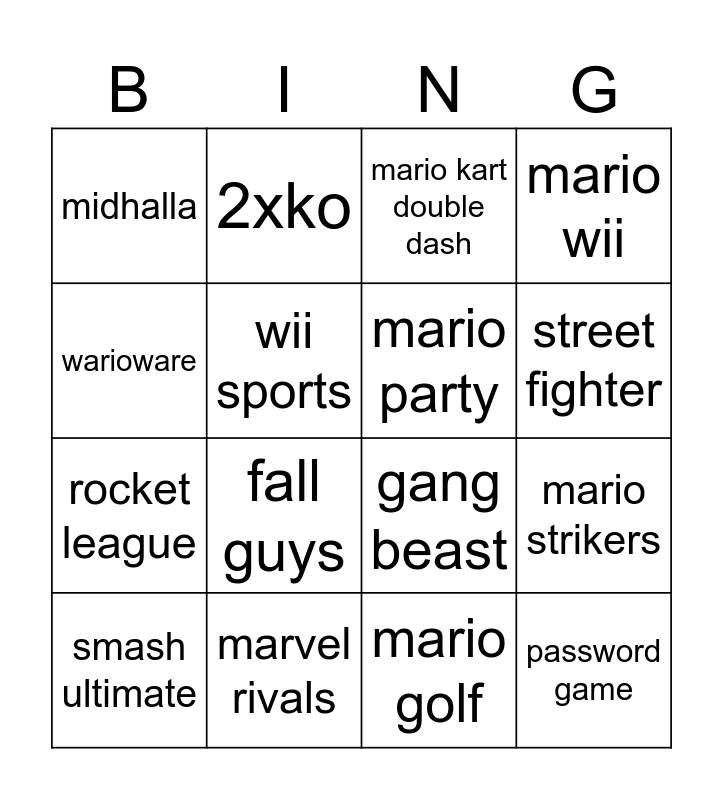 This bingo card has 16 words: marvel rivals, mario strikers, mario kart double dash, midhalla, rocket league, 2xko, gang beast, mario golf, warioware, wii sports, smash ultimate, mario wii, fall guys, street fighter, mario party and password game.