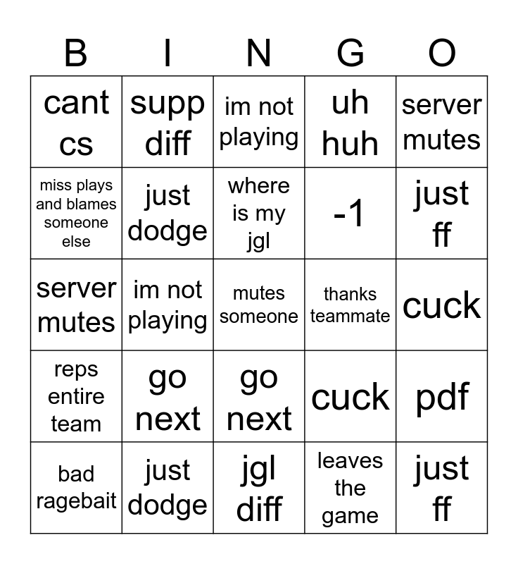 This bingo card has a free space and 49 words: idk, just ff, bad ragebait, jgl diff, go next, reps entire team, supp diff, screams at supp, miss plays and blames someone else, looks on the map excuse, just dodge, uh huh, pdf, cuck, hallo/gets call, jgl afk, where is my jgl, thanks teammate, deafens, server mutes, im not playing, leaves the game, cant cs, -1, idk, just ff, bad ragebait, jgl diff, go next, reps entire team, supp diff, screams at supp, miss plays and blames someone else, looks at map for excuse, just dodge, uh huh, mutes someone, pdf, cuck, hallo/gets call, jgl afk, where is my jgl, thanks teammate, deafens, server mutes, im not playing, leaves the game, cant cs and -1.
