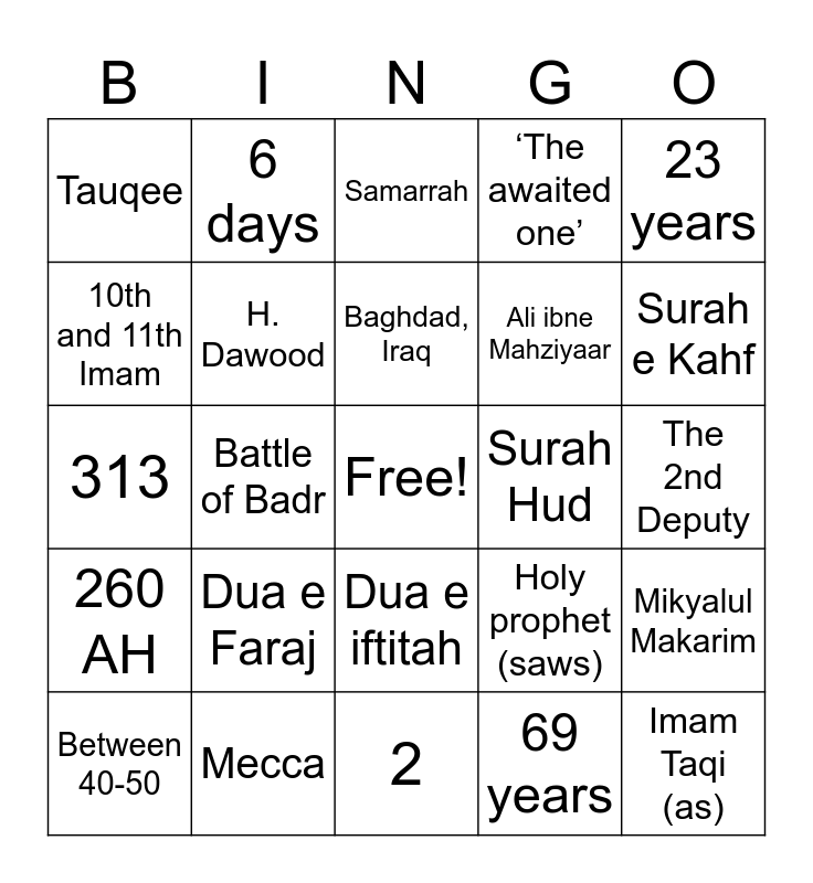 This bingo card has a free space and 99 words: 15th, Shaban, 255 AH, Samarrah, Sheikh Murtaza Ansari, Sheikh Sadooq, Mirza hussain noori, Dua e Simaat, 7 years, Imam jawad (as), Masjid e Sahla, H. Isa, H. Uzair, Dua e iftitah, Areeza, Tauqee, 6 days, Allama Majlisi, Susan, Long life, Sunan e Abi Dawood, Sheikh Kulayni, Dua e Kumail, J. Jibrael, Raj’at, Mikyalul Makarim, Baghdad, Iraq, J. Hussain bin Rouh, A Flag, It is still going on, 2, 69 years, Only A…. knows, Sheikh Tusi, Battle of Badr, 313, H. Khizr, Kufa, 40 years, Dua e Faraj, Ziyarat e Aale Yasin, Surah e Kahf, ‘The awaited one’, Mecca, Khana e Qaba, Dajjal, Banu Hashim, Sufyani, Al Qaem, 1192 years, Abal Qasim, Imam Taqi (as), Holy prophet (saws), 8 months, Ignorance, Cry, Usman bin Saeed, Mohammed bin Usman, Intezaar, Ali bin Mohammed al samari, H. Musa, Baqiyatullah, ‘The remnant of A….’, Rukn aur Maqam, Jafar e Kazzab, 23 years, Surah e Qadr, Imam Raza (as), 5 years, 260 AH, 329 AH, Ali ibne Mahziyaar, 10th and 11th Imam, 11:86, Desert of Baydha, Hujjatulah, H. Dawood, Imam Ali (as), Zulfiqar, Allama tabarsi, Surah Hud, ‘Master of the age’, ‘Proof of Allah’, ‘The guided one’, ‘The one who will rise’, ‘The Master of the affairs’, Ayatullah Gulpaighani, Imam Sajjad (as), The 2nd Deputy, Between 40-50, The 4th Deputy, Around 3 years, Dua e Shab’boor, 74 years old, Raazi Billah, Imam Jafar (as), Mirza ali mohammed Shirazi, Dua e Ghareeq and Armour (Zira’a).