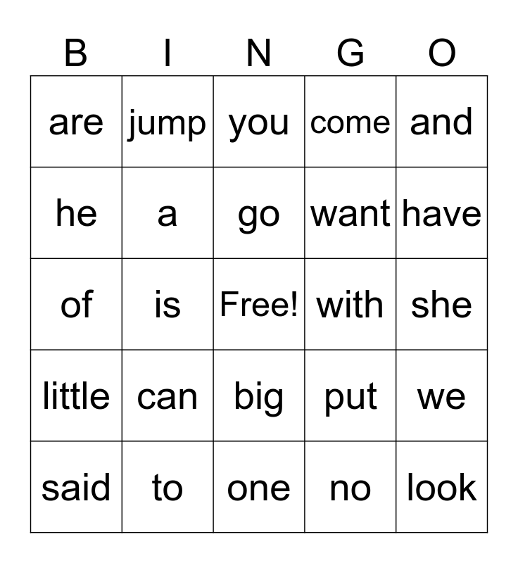 This bingo card has a free space and 37 words: I, like, the, a, we, can, go, see, and, here, is, come, look, she, he, little, play, you, big, with, are, have, said, one, for, no, jump, two, has, this, my, to, of, what, put, want and saw.
