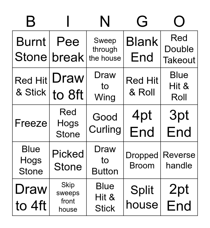 This bingo card has a free space and 39 words: Red Raises Stone, Blue Raises Stone, Draw to 12ft, Draw to 8ft, Draw to 4ft, Draw to Button, Draw to Wing, Blue Double Takeout, Red Double Takeout, Blue Hogs Stone, Red Hogs Stone, Blank End, 2pt End, 3pt End, 4pt End, Picked Stone, Over Swept Draw, Burnt Stone, Measuring Stones, Dropped Broom, Red Hit & Stick, Blue Hit & Stick, Red Hit & Roll, Blue Hit & Roll, Center Guard, Corner Guard, Long Center Guard, Flash, Take a look., Pee break, Drink refill, Through the house., Sweep through the house, Skip sweeps front house, Split house, Throw it through, Reverse handle, Freeze and Biter.