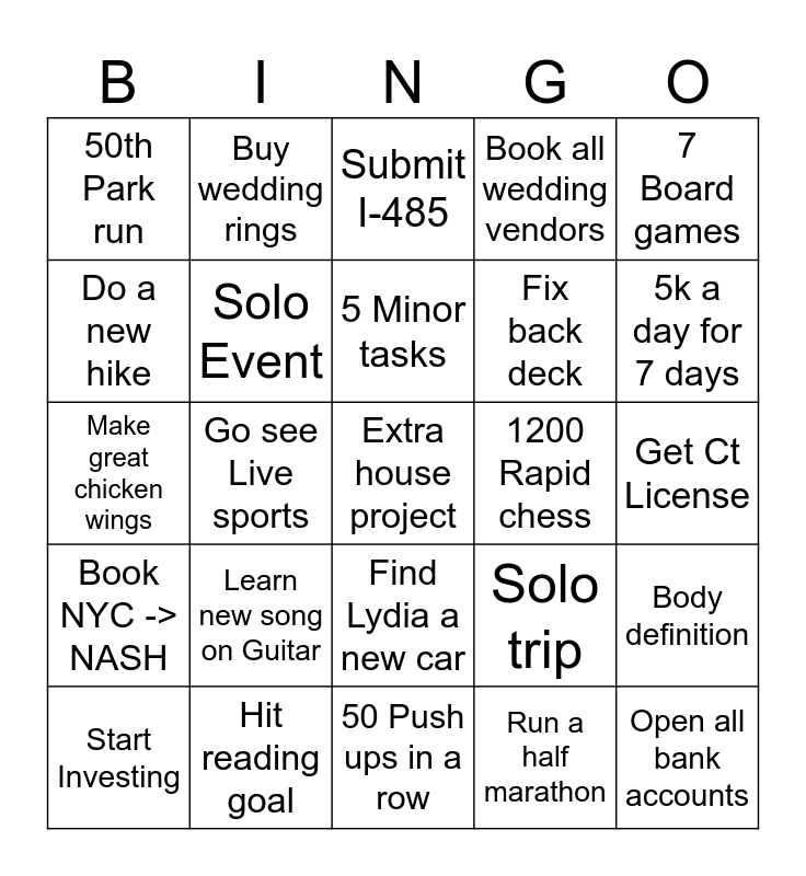 This bingo card has a free space and 24 words: Learn new song on Guitar, Hit reading goal, 5 Minor tasks, Start Investing, 7 Board games, 50th Park run, Do a new hike, Buy wedding rings, 1200 Rapid chess, Find Lydia a new car, Fix back deck, Make great chicken wings, Solo trip, Body definition, Solo Event, Run a half marathon, Get Ct License, Submit I-485, 5k a day for 7 days, Go see Live sports, Open all bank accounts, Book NYC -> NASH, Book all wedding vendors and 50 Push ups in a row.