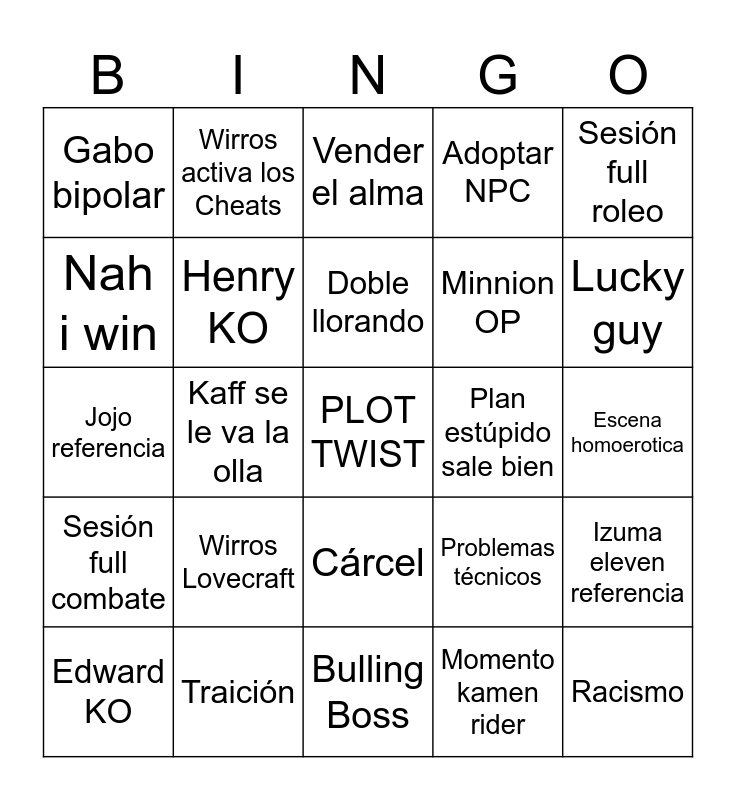 This bingo card has a free space and 39 words: Laufey KO, Leaxel KO, Urias KO, Henry KO, Edward KO, Cárcel, Doble llorando, Jeri suicida, Sesión full roleo, Sesión full combate, Kaff se le va la olla, Adoptar NPC, Racismo, Escena homoerotica, Plan estúpido sale bien, Wirros Lovecraft, Momento autista, Gabo bipolar, Monologo Jeri, Problemas técnicos, Nah i win, Bulling Boss, Minnion OP, Lucky guy, Romance, Casi TPK, Momento SAD, Misión secundaria meme, Se me olvido que tenia esto, Wirros activa los Cheats, X es congelado, Charme unlucky, Vender el alma, Traición, Momento kamen rider, Neuron activation, Izuma eleven referencia, Jojo referencia and X Muere.