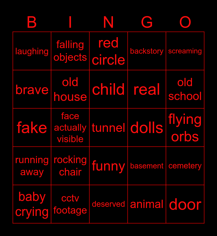 This bingo card has a free space and 24 words: rocking chair, cctv footage, child, baby crying, screaming, laughing, brave, falling objects, dolls, funny, real, fake, basement, cemetery, old house, animal, flying orbs, red circle, old school, face actually visible, door, running away, backstory and deserved.