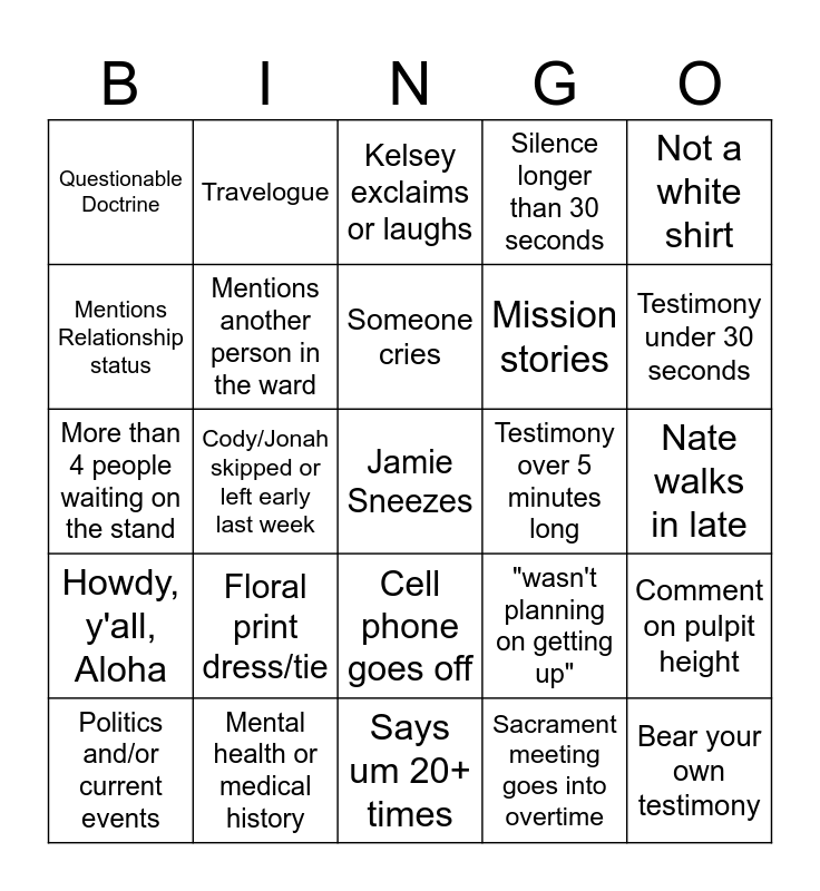 This bingo card has a free space and 28 words: Comment on pulpit height, Reads something, Mission stories, Sacrament meeting goes into overtime, Mentions Relationship status, Kelsey exclaims or laughs, Travelogue, Howdy, y'all, Aloha, Testimony over 5 minutes long, Politics and/or current events, More than 4 people waiting on the stand, Silence longer than 30 seconds, Mental health or medical history, Says um 20+ times, Testimony under 30 seconds, No Gospel principles mentioned, Floral print dress/tie, Mentions another person in the ward, Someone cries, Cell phone goes off, Questionable Doctrine, Trauma Dumping, Bear your own testimony, Cody/Jonah skipped or left early last week, Nate walks in late, "wasn't planning on getting up", Not a white shirt and "Had a rough week".